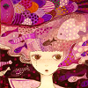 Description: a girl wearing a wide-brimmed hat surrounded by pink fish