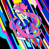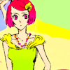 Description: pink-haired art-deco-y girl over art deco background, bright pink/blue/teal/red